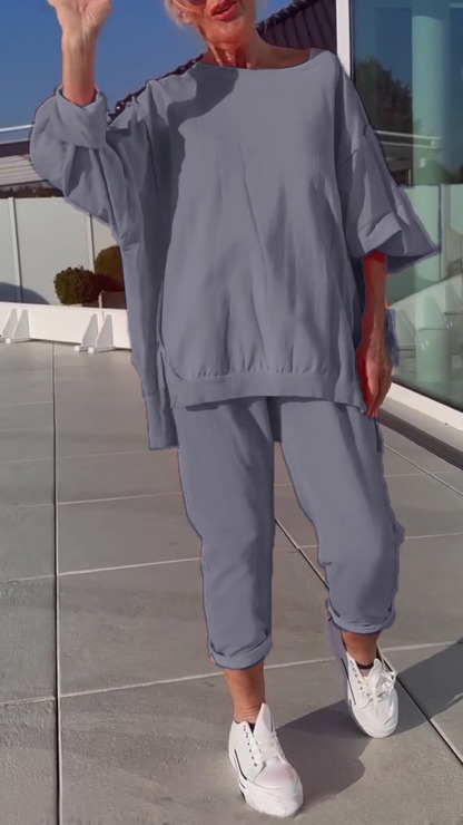 Women's Round Neck Slit Fluorescent Color Casual Suit